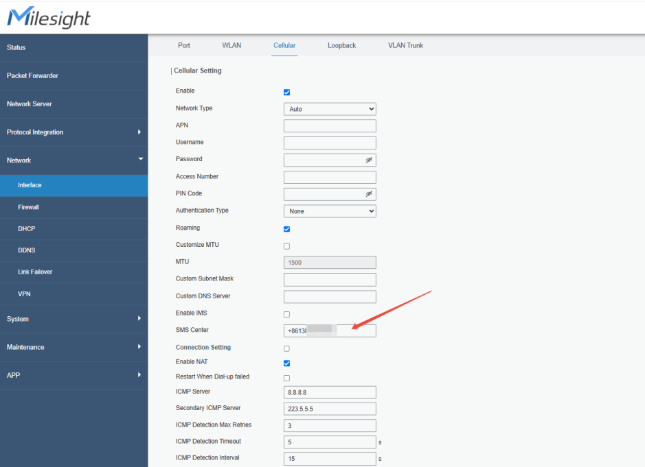 Insert the SIM in the gateway . Go to Network>Interface>Cellular, set the required parameters and fill in regional SMS center number of the SIM card inserted in the gateway (note: this is not the SIM card’s phone number). You can search online for the SMS center number of your current SIM card or contact your carrier to obtain it.