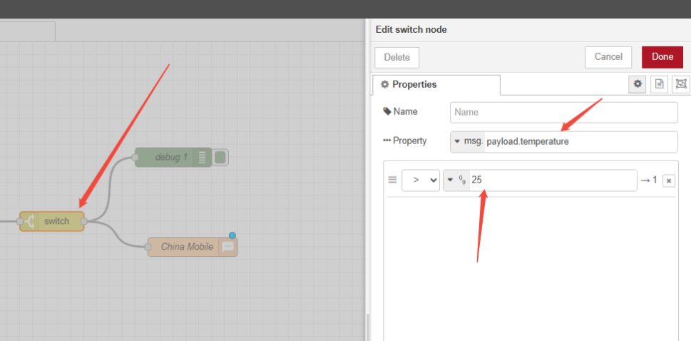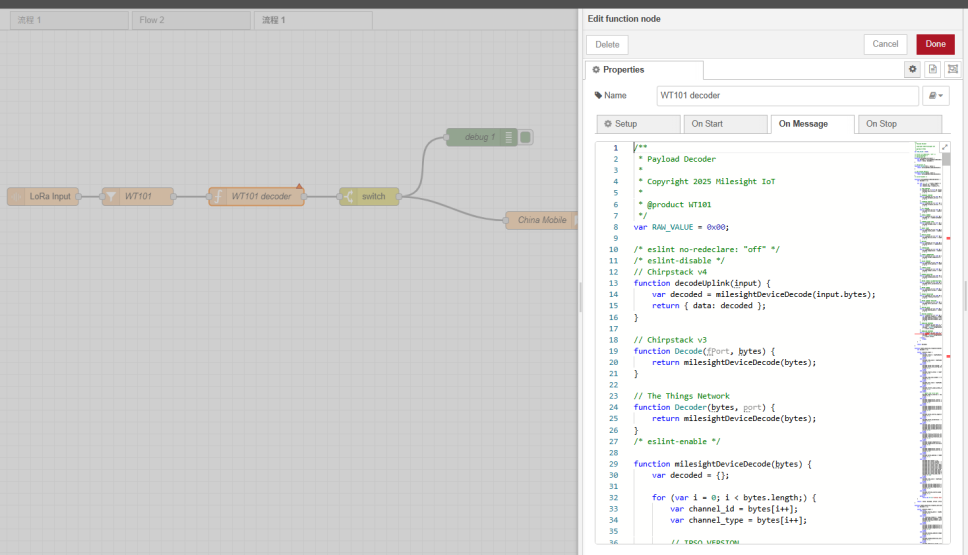 Milesight UG6X/UG56 gateway support build-in Node-red. This Node-Red example provides a solution for triggering SMS alarms using Node-Red. and takes an example of triggering an SMS alarm when the EM300 temperature exceeds 26°C.