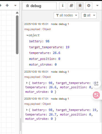 (5) Debug: Display selected message properties in the debug sidebar tab and optionally the runtime log. Here, we use it to see sensor uplink package content, keep Output as payload by default.