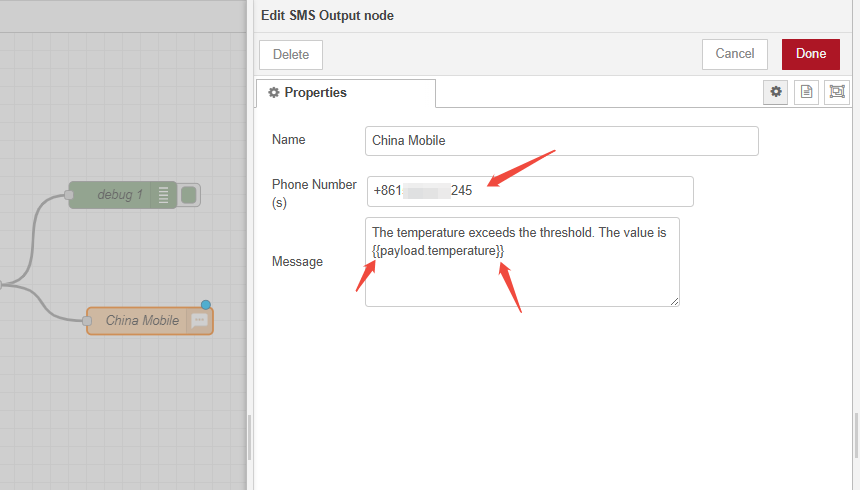 (6) SMS Output: This is the output setting for the text message. You need to add the phone number that should receive alarm messages in "Phone Number", and the actual output value should be enclosed in {{}}.