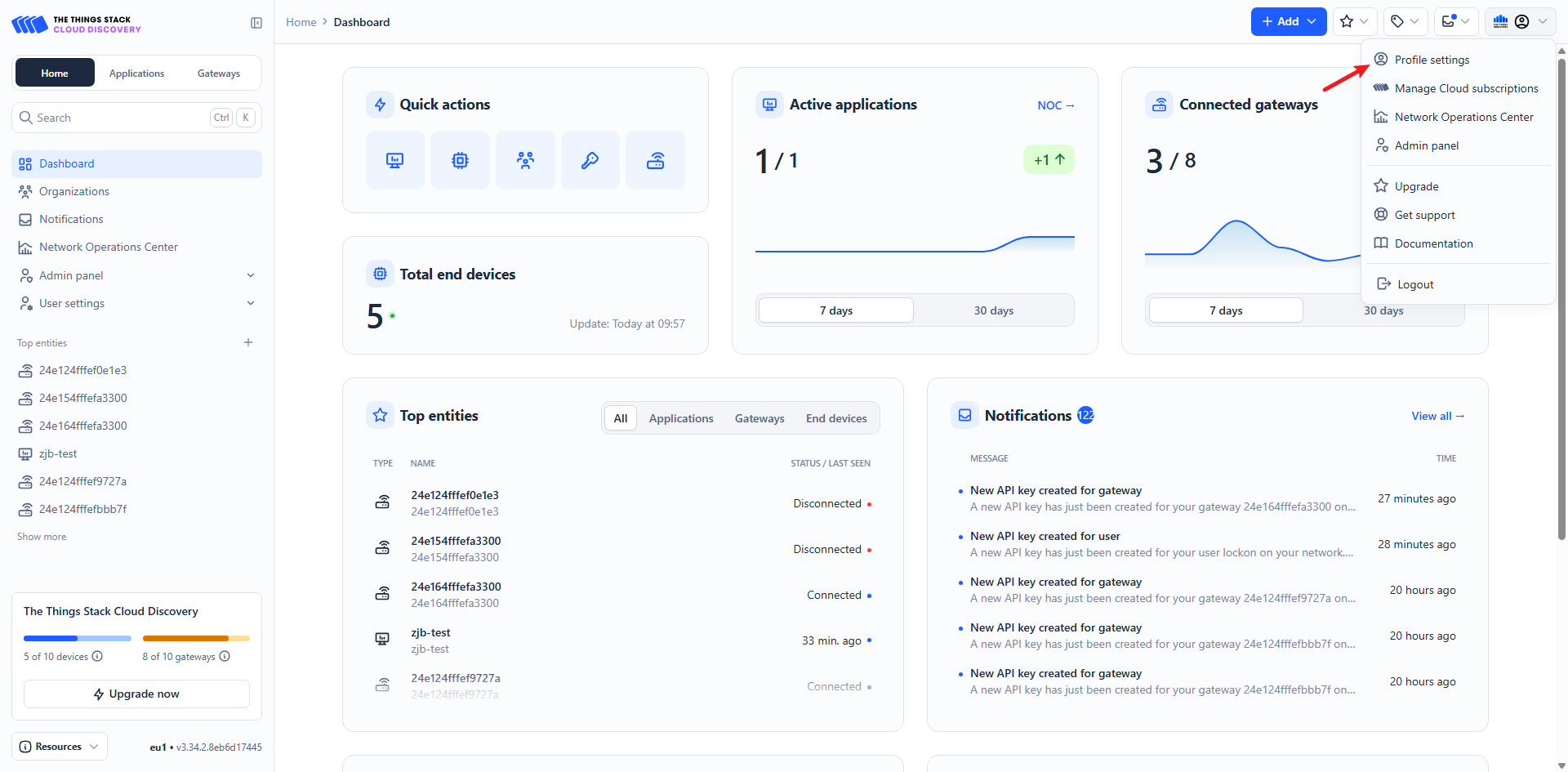 - Check whether your The Things Industries account has sufficient gateway quota. Generally, accounts verified with a free credit card can only support up to 10 gateways (see figure below).