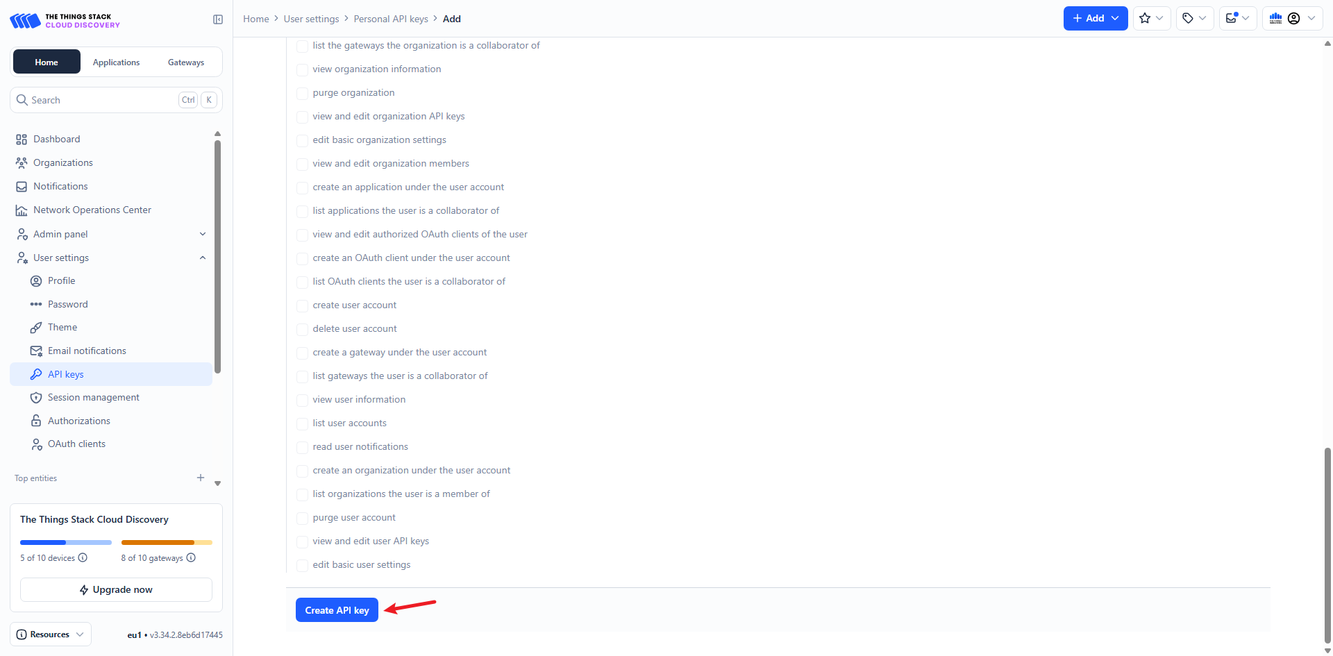 (The message “3 of 10 gateways” in the screenshot means that you currently have 3 gateways out of a total quota of 10, so you can still add 7 more gateways. If it shows “10 of 10”, then you will encounter the issue you are facing now. ) - Check whether your API key was created correctly. It must be created under User → API Keys, not under Application → API Keys.