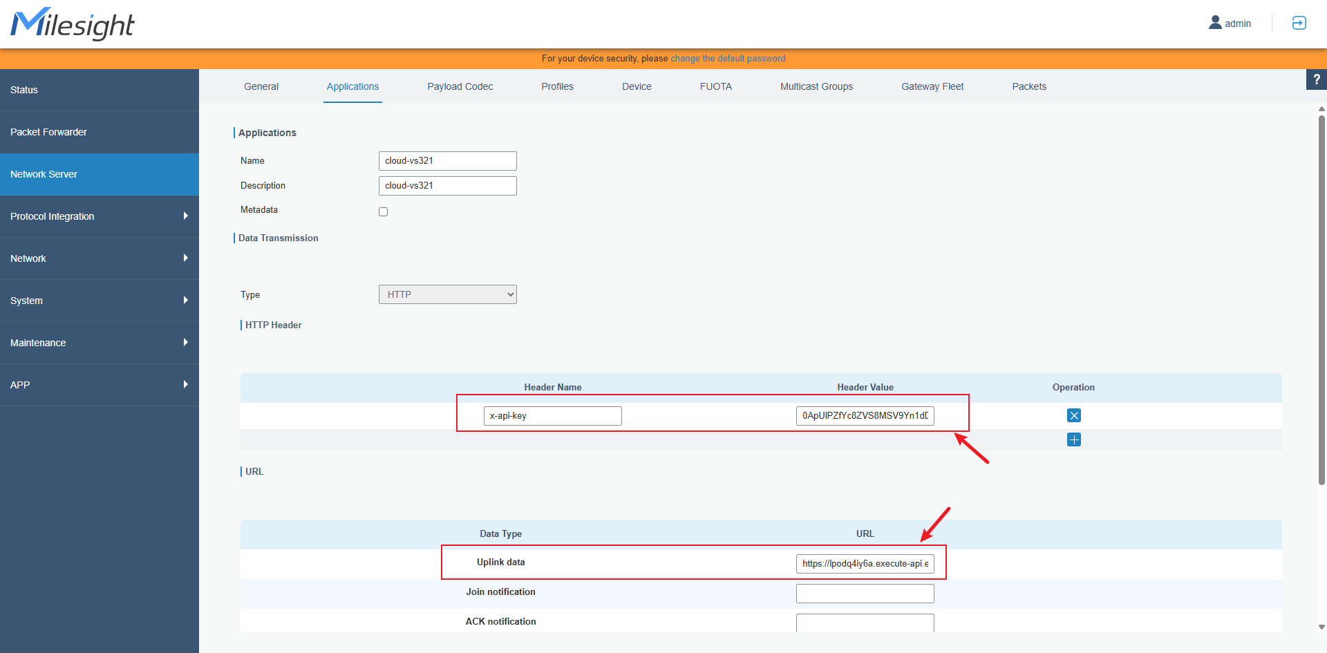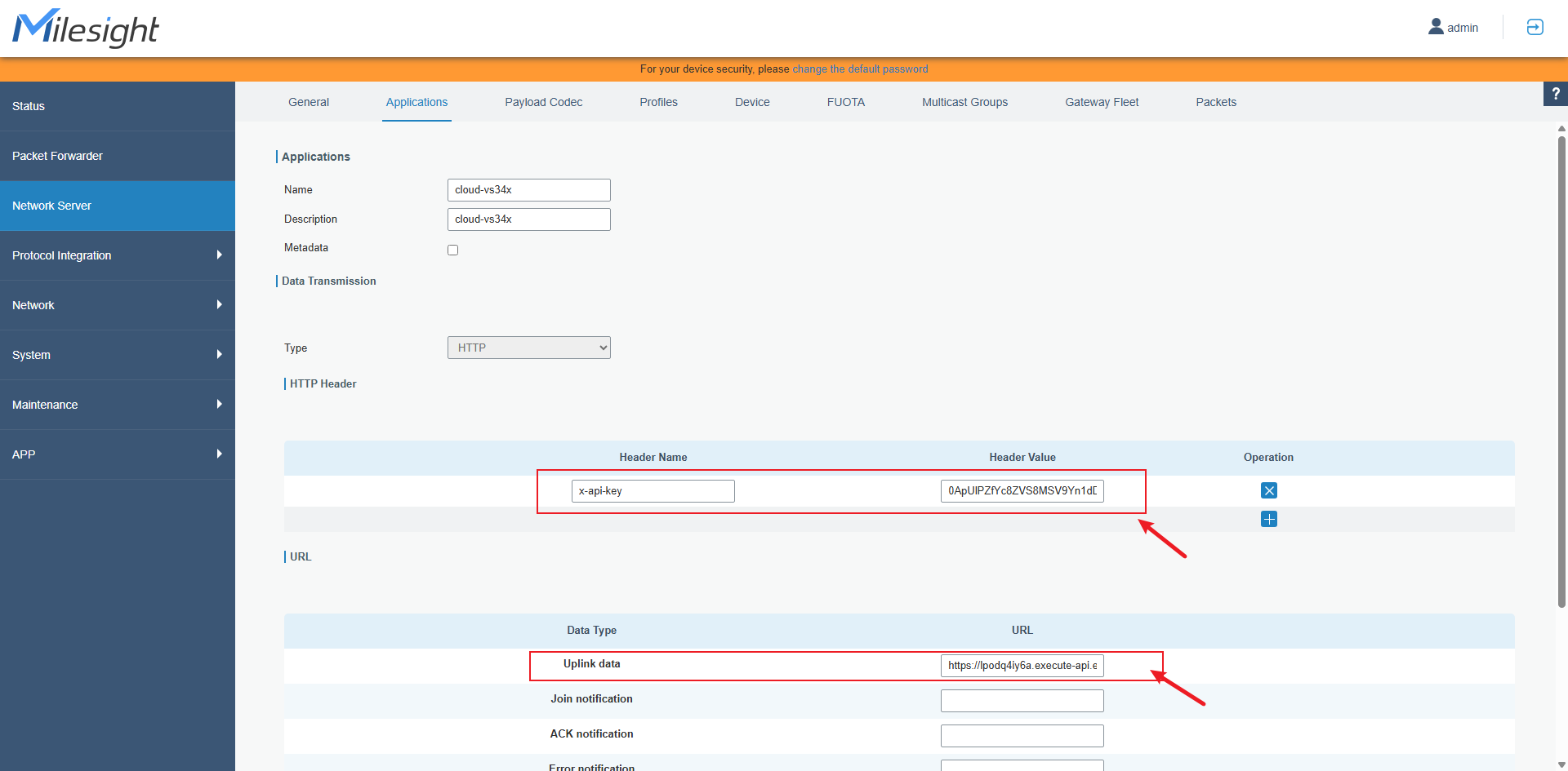 Refer to the guide: “How to Connect Milesight LoRaWAN Gateway to HTTP(s) Server?”, and configure the previously obtained URL and x-api-key parameters into the gateway.